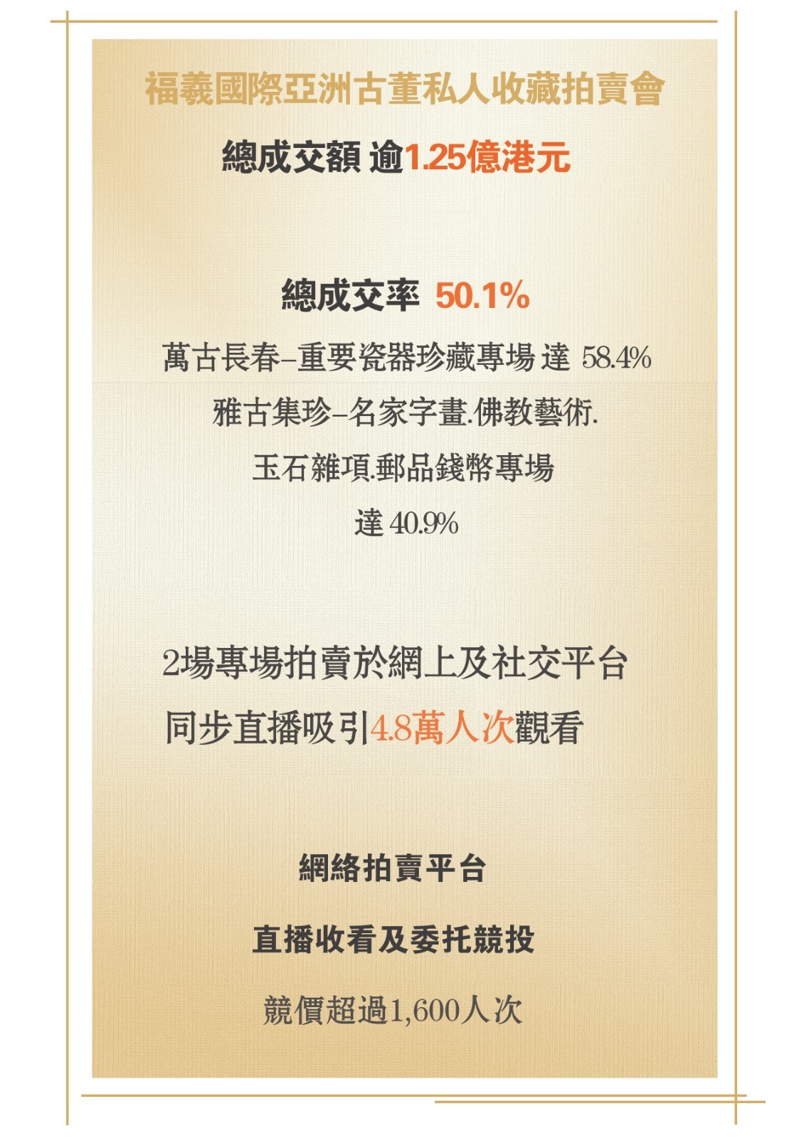 香港福羲國際衷心感謝閣下的關註註與支持。香港福羲國際拍賣今後將一如既往,竭誠為您服務,為您提供更好的拍賣體驗。福羲國際拍賣行有賴各藏家支持,藉此機會我們衷心地對各位藏家、各位買家及朋友致以最真摯的感謝!